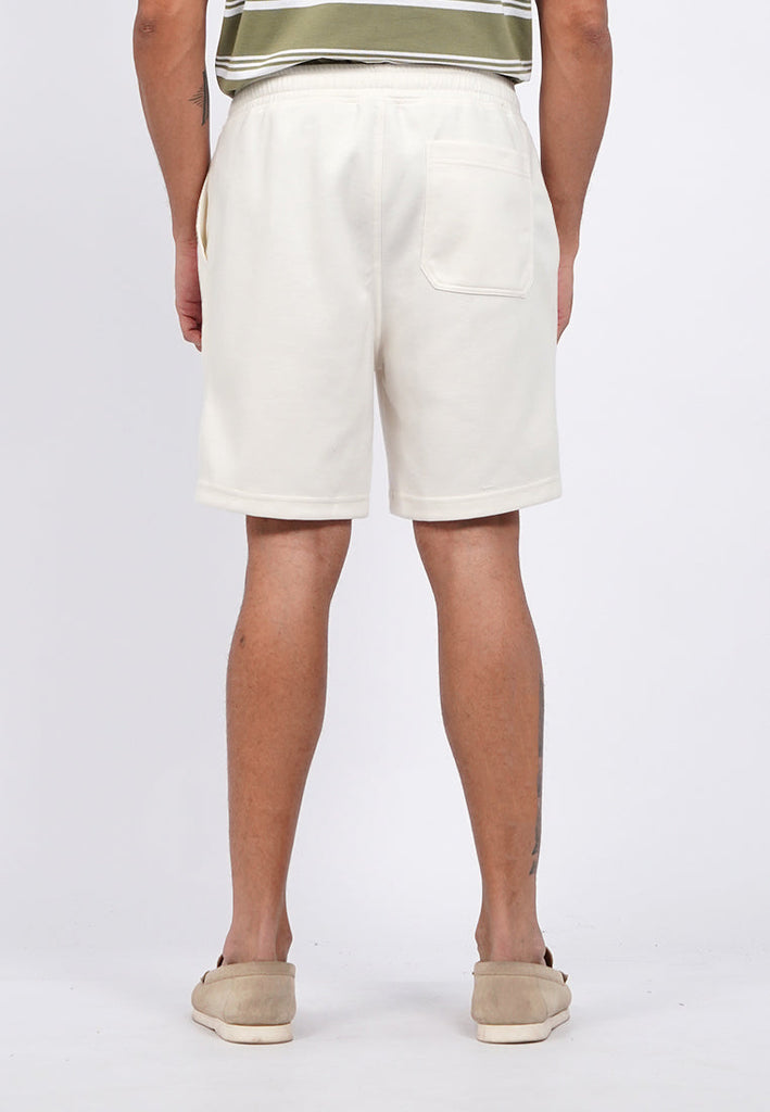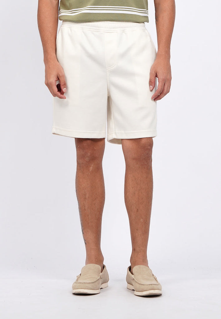 Celana pendek bahan knit, 7" inseam, Elastic waist, Back pocket details, Material: Cotton Spandex, Fit: Regular, Color: Ecru, Model info: Model Wearing Size M, Height: 182 cm, Chest: 94 cm, Waist: 75 cm, Hips: 96 cm