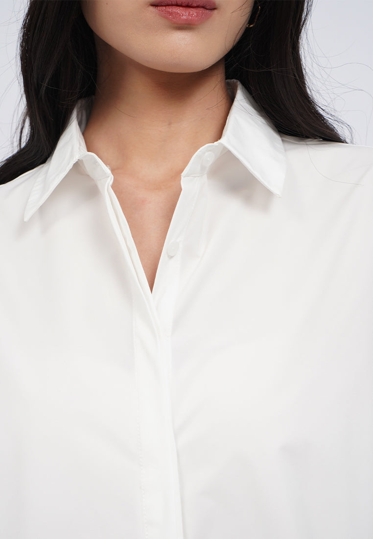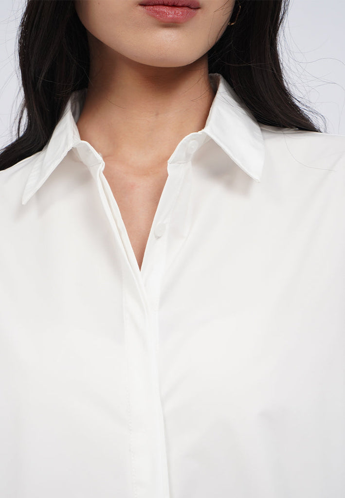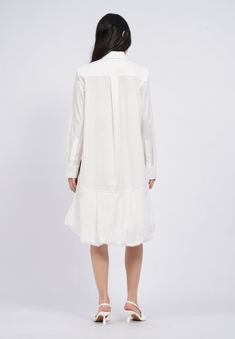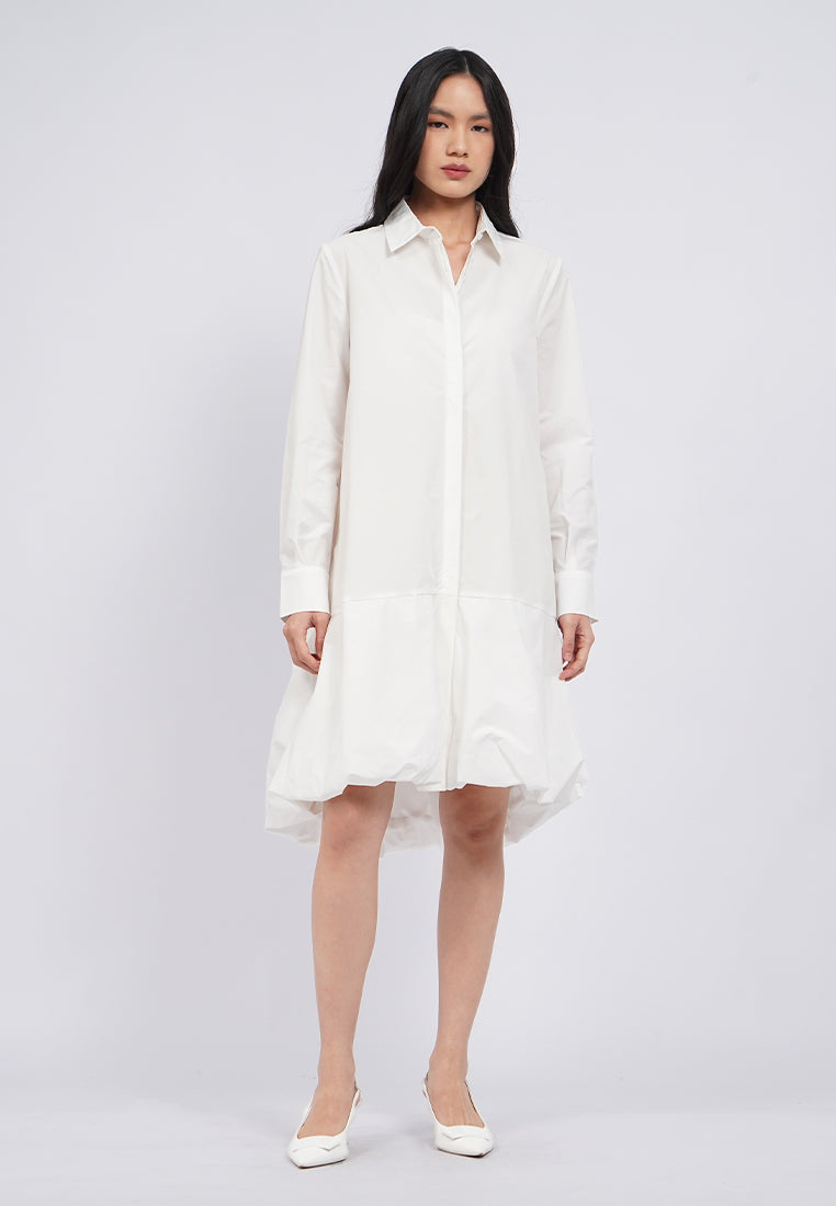 Mini dress lengan panjang, Shirt collar, Balloon bottom details, Front button opening, Material: Cotton, Fit: Loose, Color: Off White, Model info: Model Wearing Size S, Height: 168cm, Bust: 74cm, Waist: 62cm, Hips: 86cm