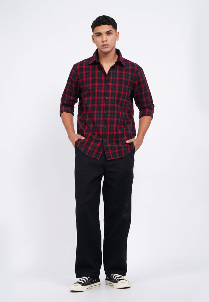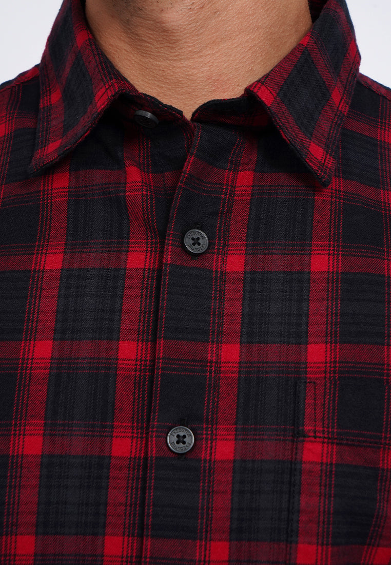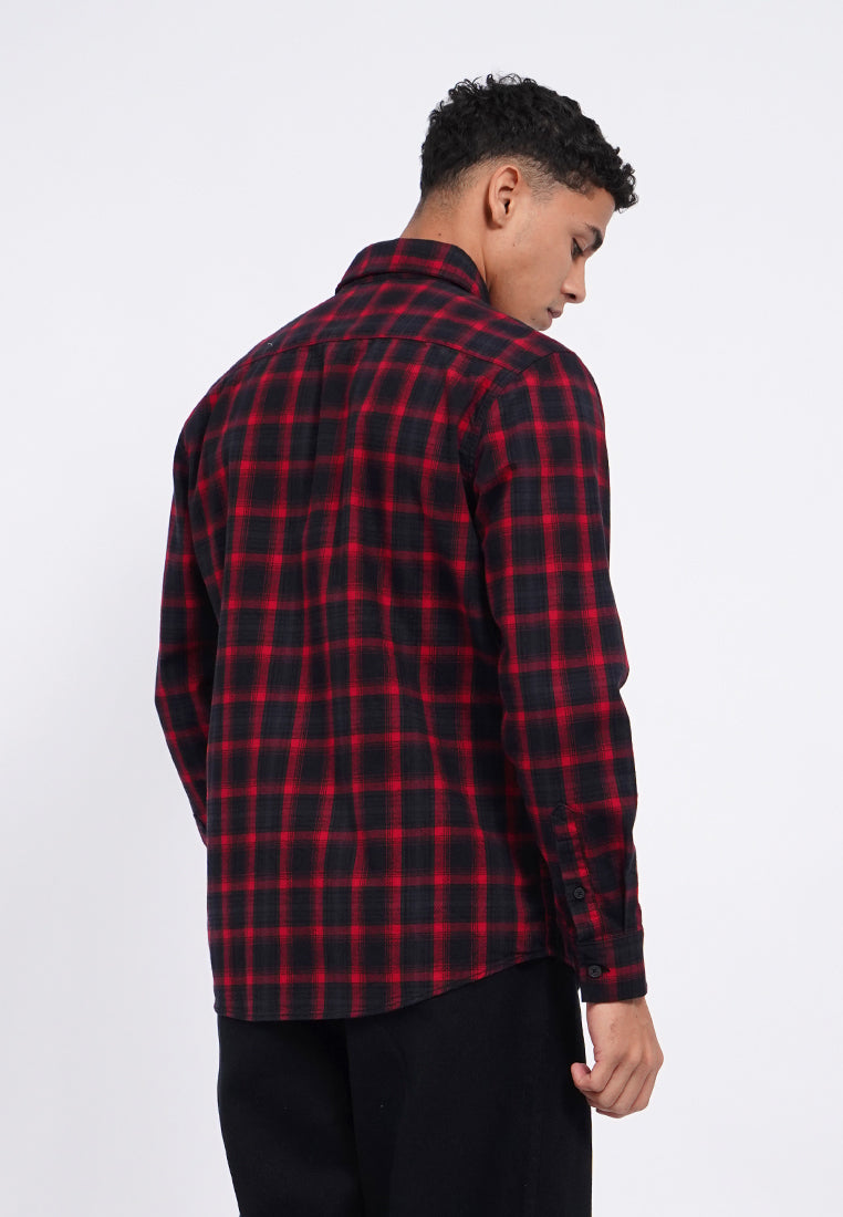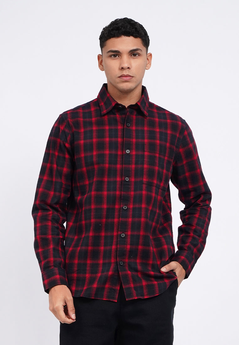 Kemeja lengan panjang, Square front pocket, Front button opening, Checks printed fabric, Material: Cotton, Fit: Regular, Color: Red, Model info: Model Wearing Size 15.5, Height: 182 cm, Chest: 94 cm, Waist: 75 cm, Hips: 96 cm
