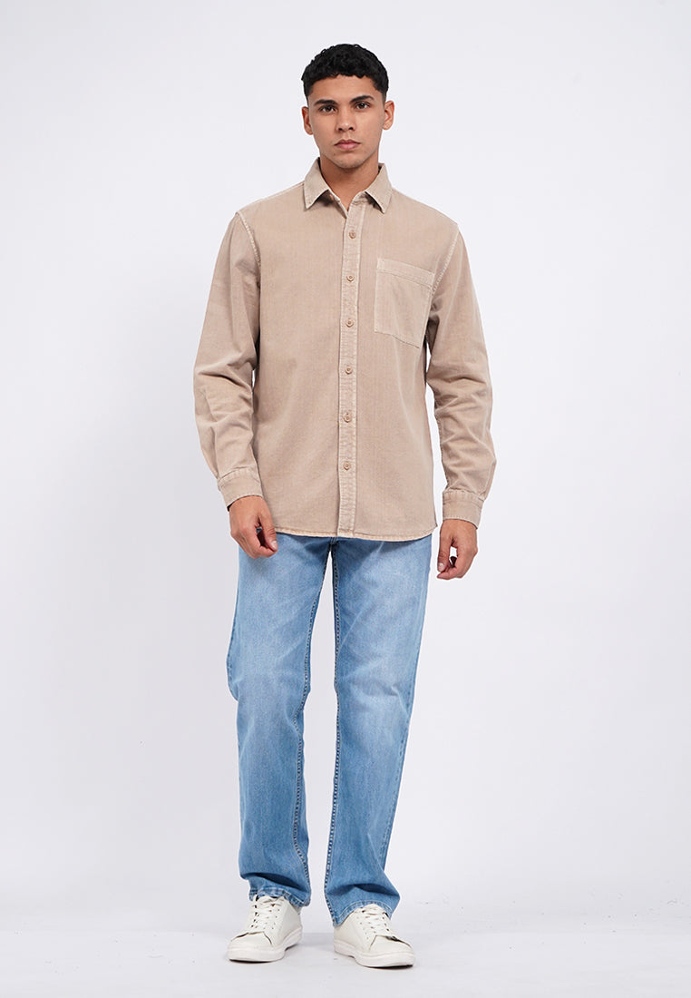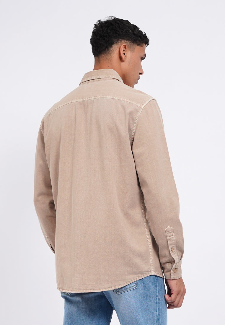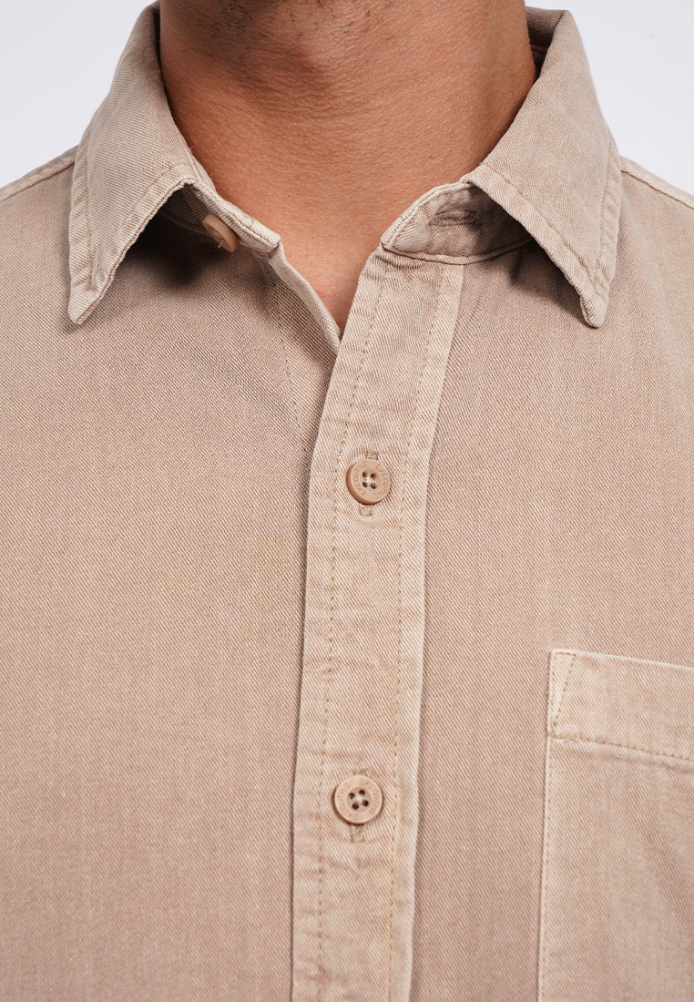 Kemeja lengan panjang, Square front pocket, Garment dyed fabric, Front button opening, Material: Cotton, Fit: Regular, Color: Taupe, Model info: Model Wearing Size 15.5, Height: 182 cm, Chest: 94 cm, Waist: 75 cm, Hips: 96 cm