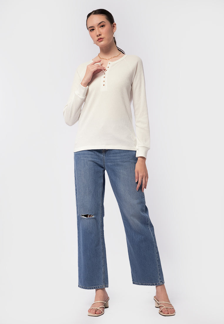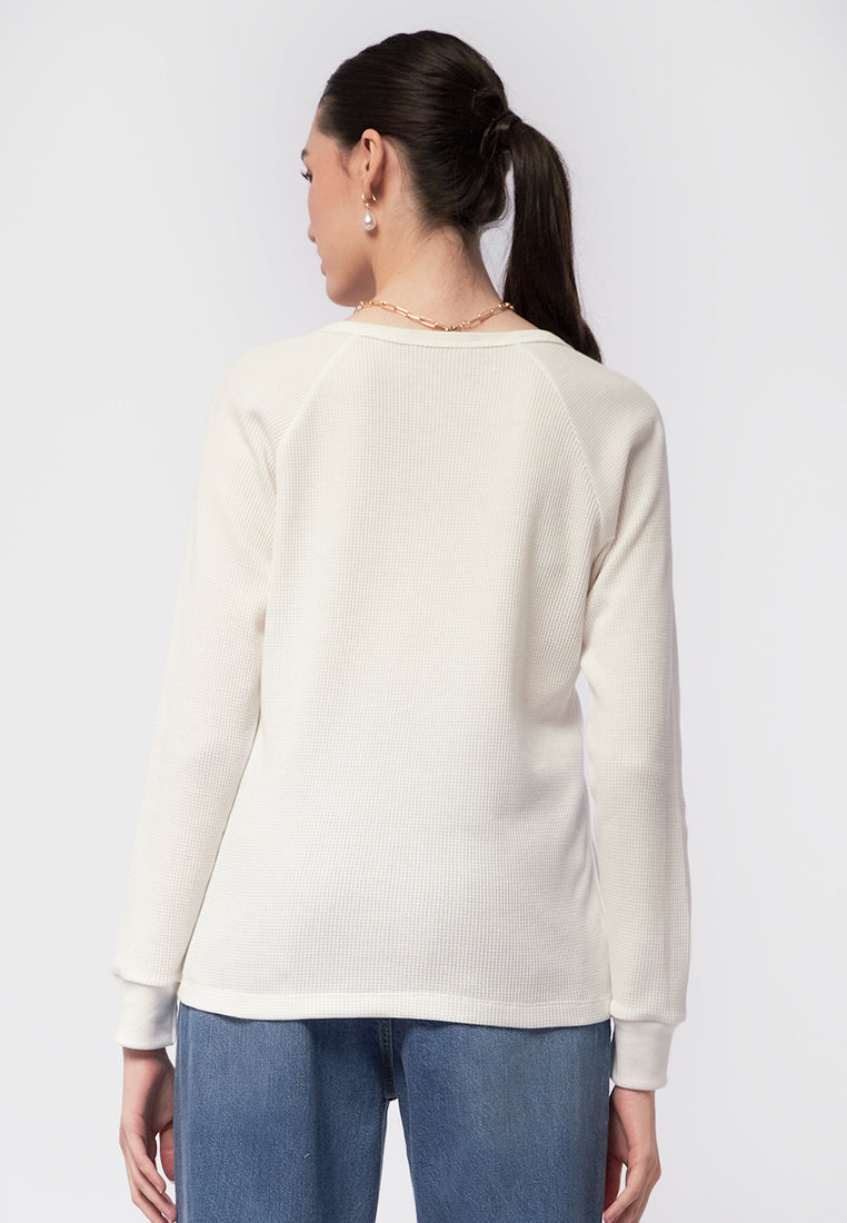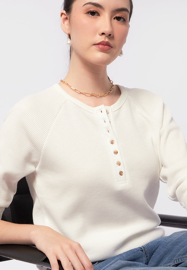 T-shirt lengan panjang, Henley collar, Front button opening, Raglan sleeves, Material: Flat Knit, Fit: Regular, Color: Off White, Model info: Model Wearing Size S for Top, Size 25 for Pants, Model Height 175 cm, Bust: 77 cm, Hips: 88 cm, Art: 5-TLKKSG124E049