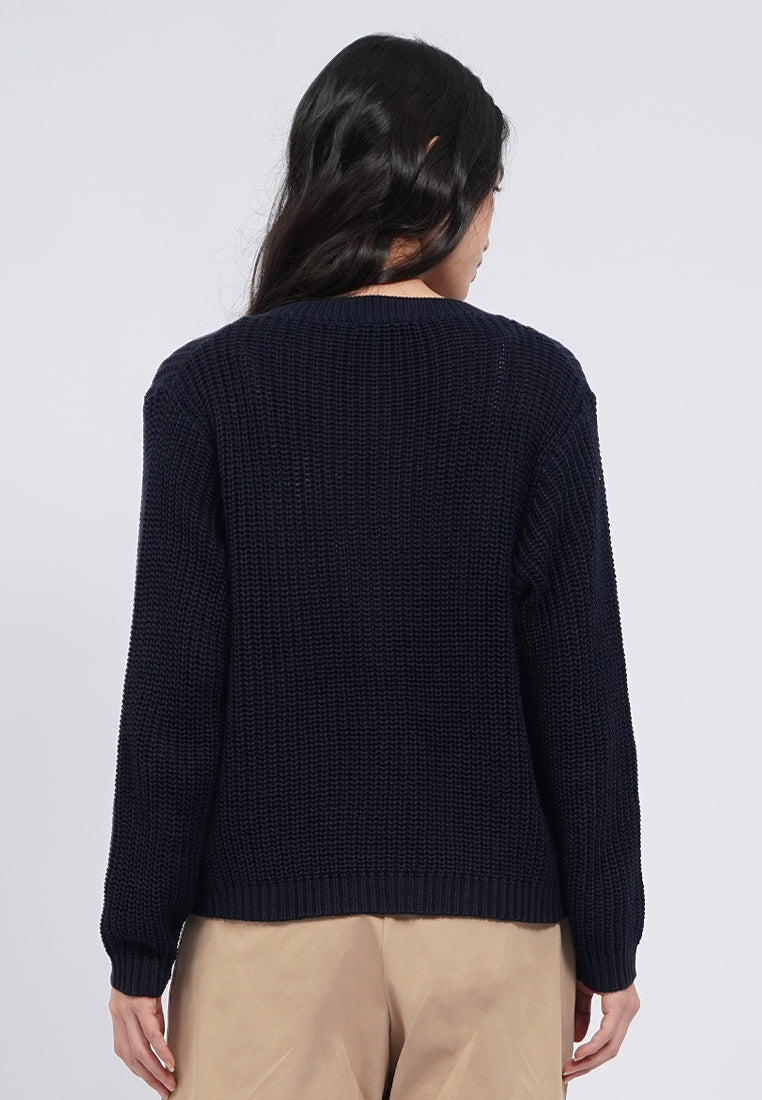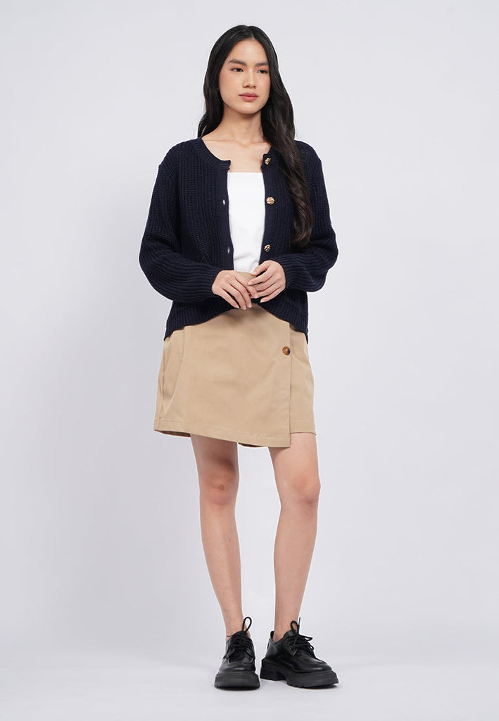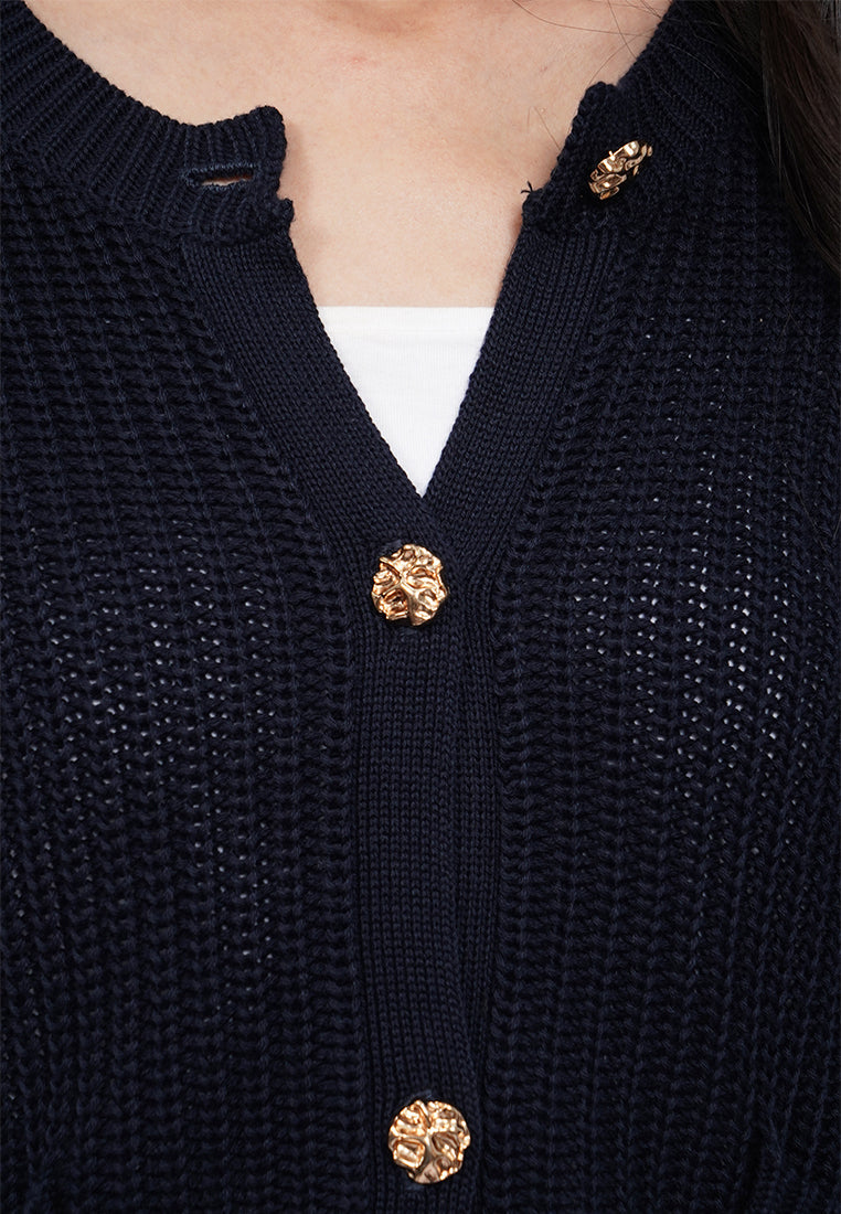 Cardigan lengan panjang, Round neck, Double front pocket, Contrast fancy button opening, Material: Cotton Acrylic, Fit: Regular, Color: Navy, Model info: Model Wearing Size S, Height: 168cm, Bust: 74cm, Waist: 62cm, Hips: 86cm
