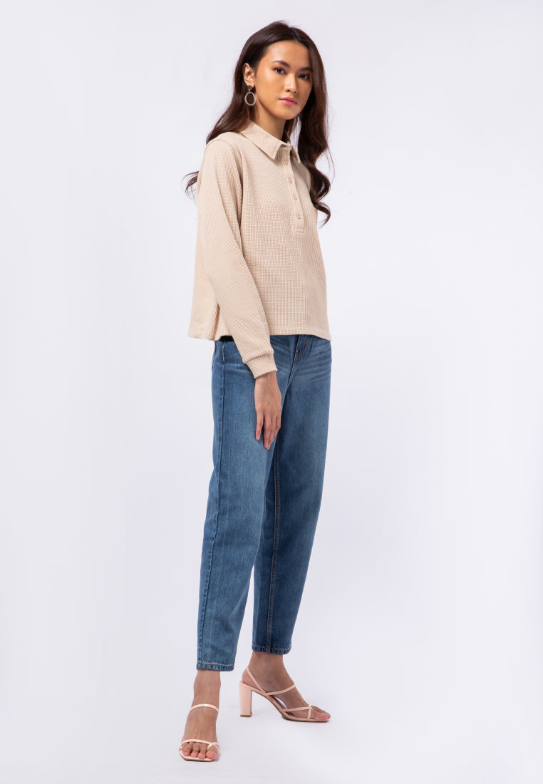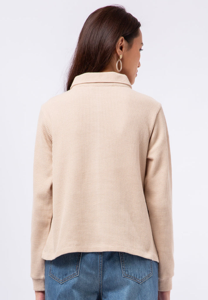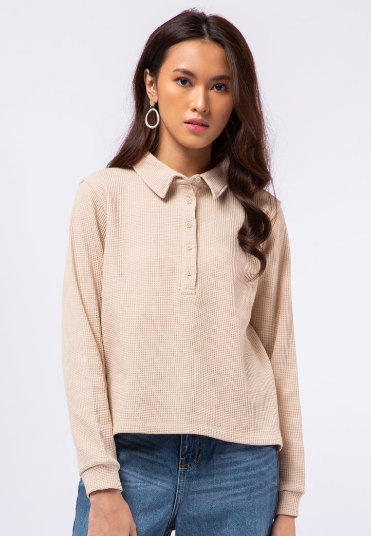 Atasan lengan panjang, Kerah kemeja, Waffle textured fabric, Front button opening, Material: CVC, Fit: Regular, Color: Sand, Model info: Model Wearing Size S For Tops, Model Height 174 cm, Bust: 78 cm, Waist: 70 cm, Hips: 90 cm, Art: 5-TLKKCA122D130