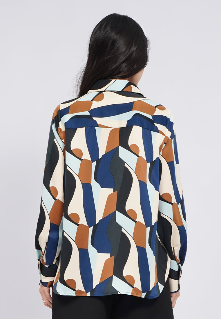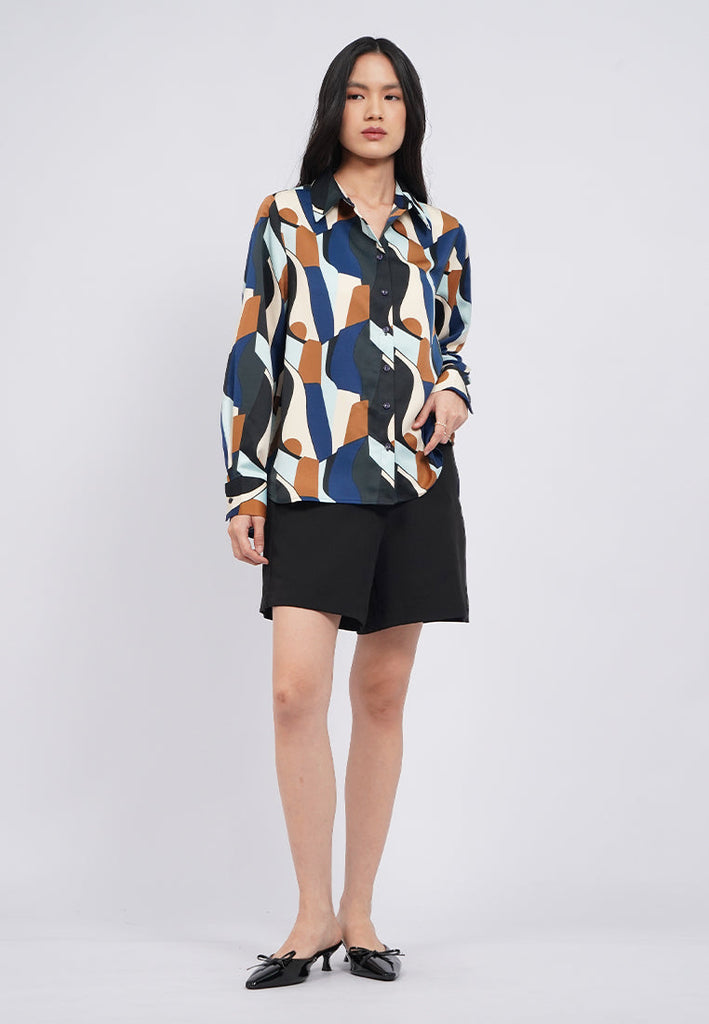 Blouse lengan panjang, Kerah kemeja, Front button opening, Abstract printed fabric, Material: Polyester, Fit: Regular, Color: Navy, Model info: Model Wearing Size S, Height: 168cm, Bust: 74cm, Waist: 62cm, Hips: 86cm