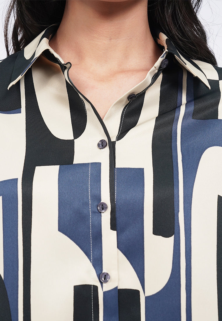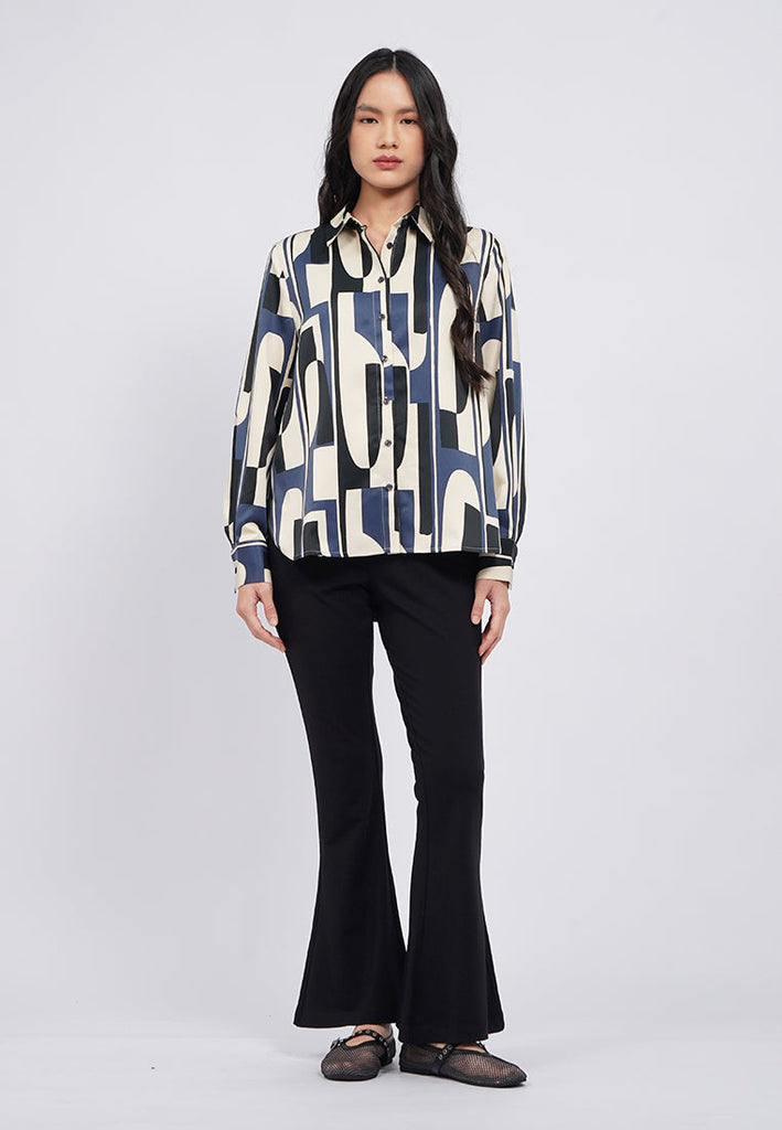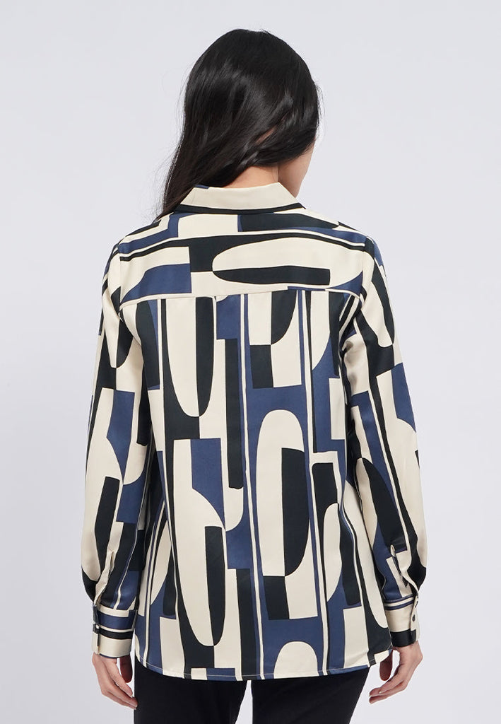 Blouse lengan panjang, Kerah kemeja, Front button opening, Abstract printed fabric, Material: Polyester, Fit: Loose, Color: Off White, Model info: Model Wearing Size S, Height: 168cm, Bust: 74cm, Waist: 62cm, Hips: 86cm