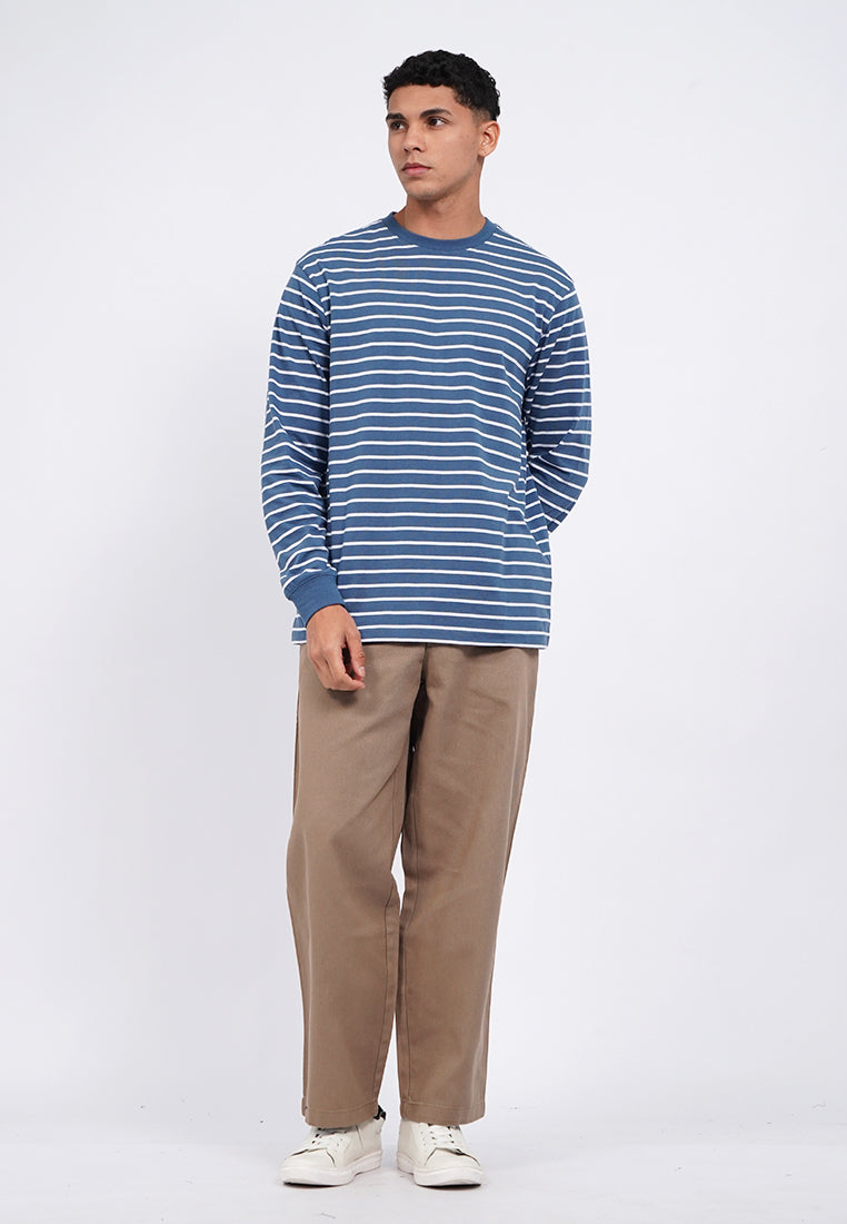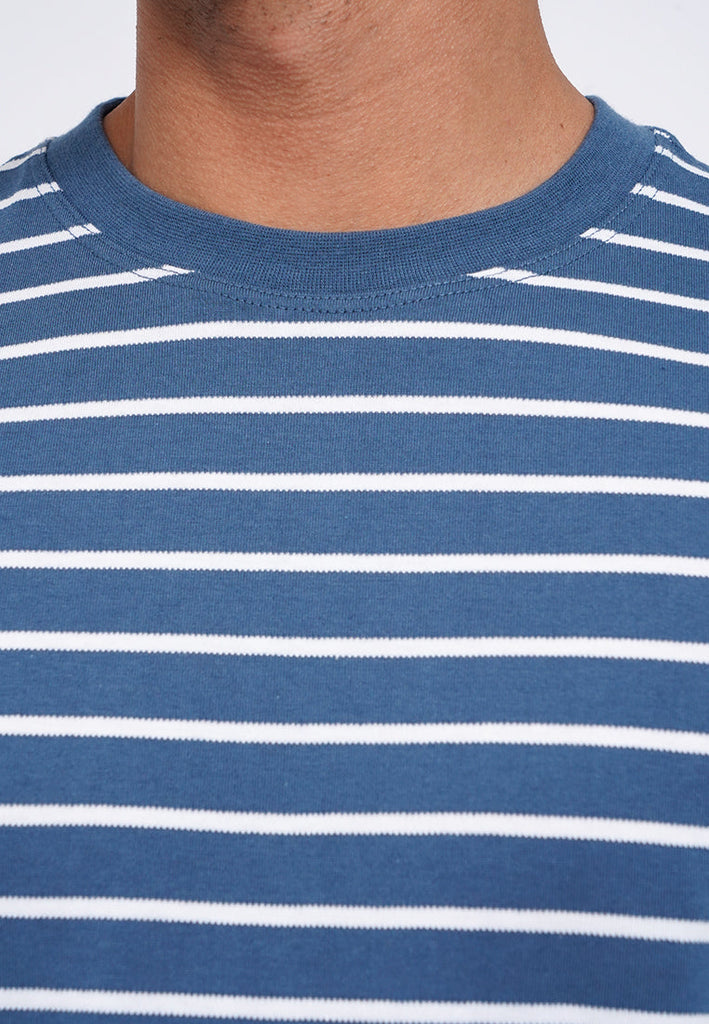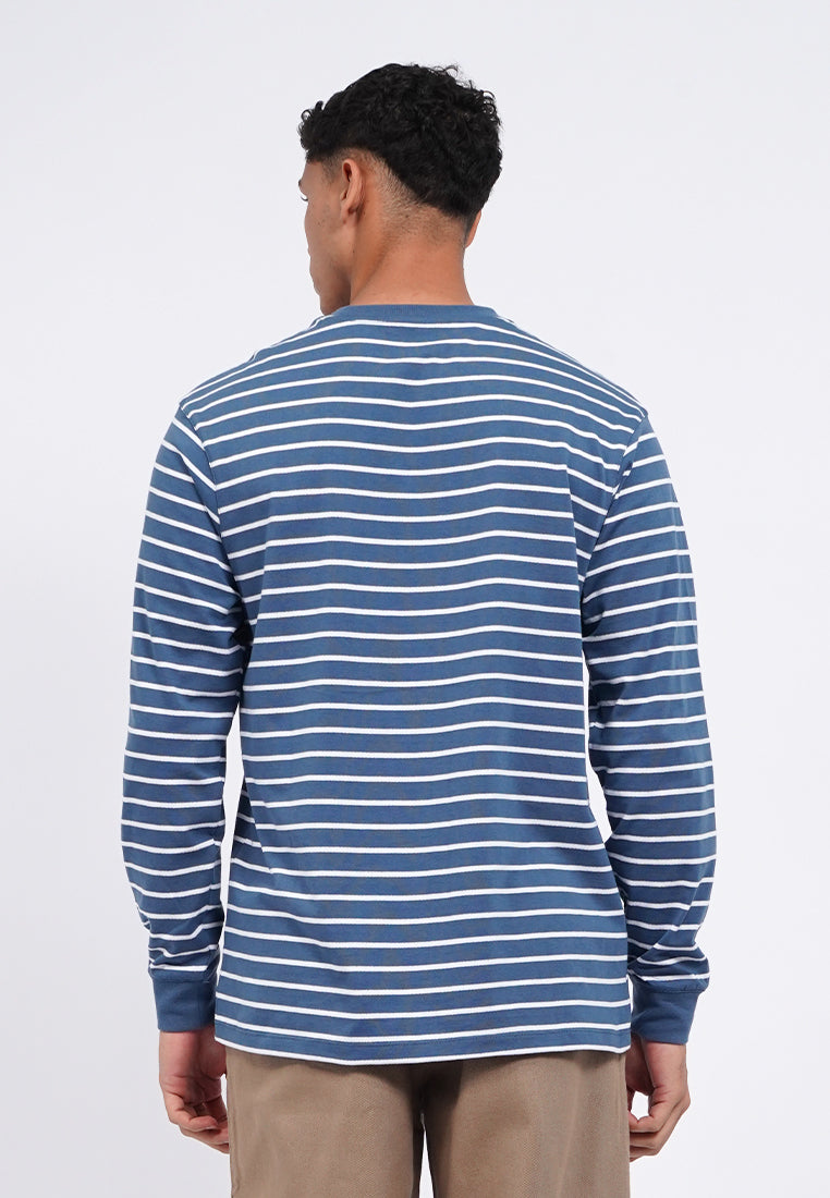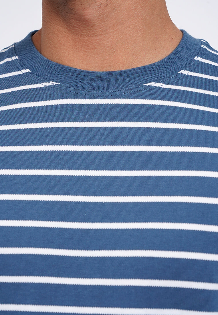 T-shirt lengan panjang, Round neck, Stripes printed fabric, Material: Cotton Stretch, Fit: Regular, Color: Indigo, Model info: Model Wearing Size M, Height: 182 cm, Chest: 94 cm, Waist: 75 cm, Hips: 96 cm