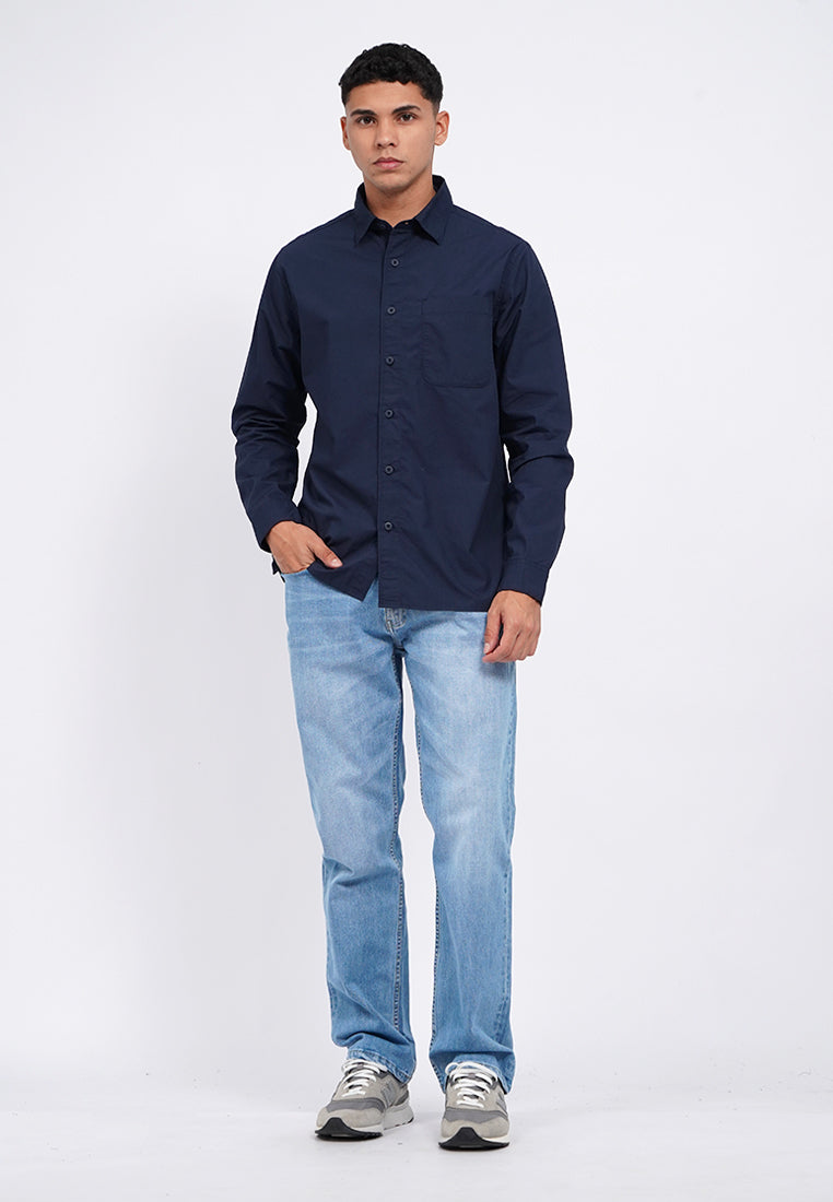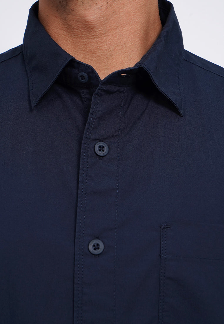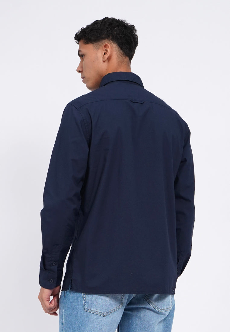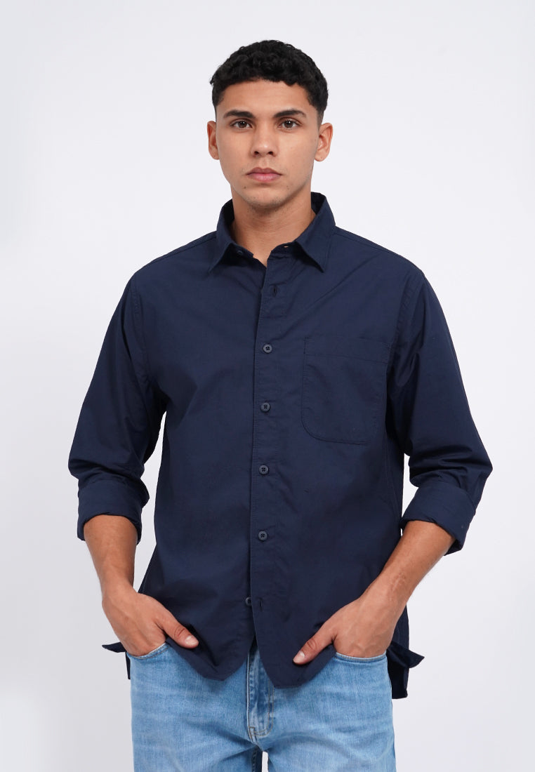 Kemeja lengan panjang, Rounded front pocket, Front button opening, Washed fabric, Material: Cotton, Fit: Regular, Color: Navy, Model info: Model Wearing Size 15.5, Height: 182 cm, Chest: 94 cm, Waist: 75 cm, Hips: 96 cm