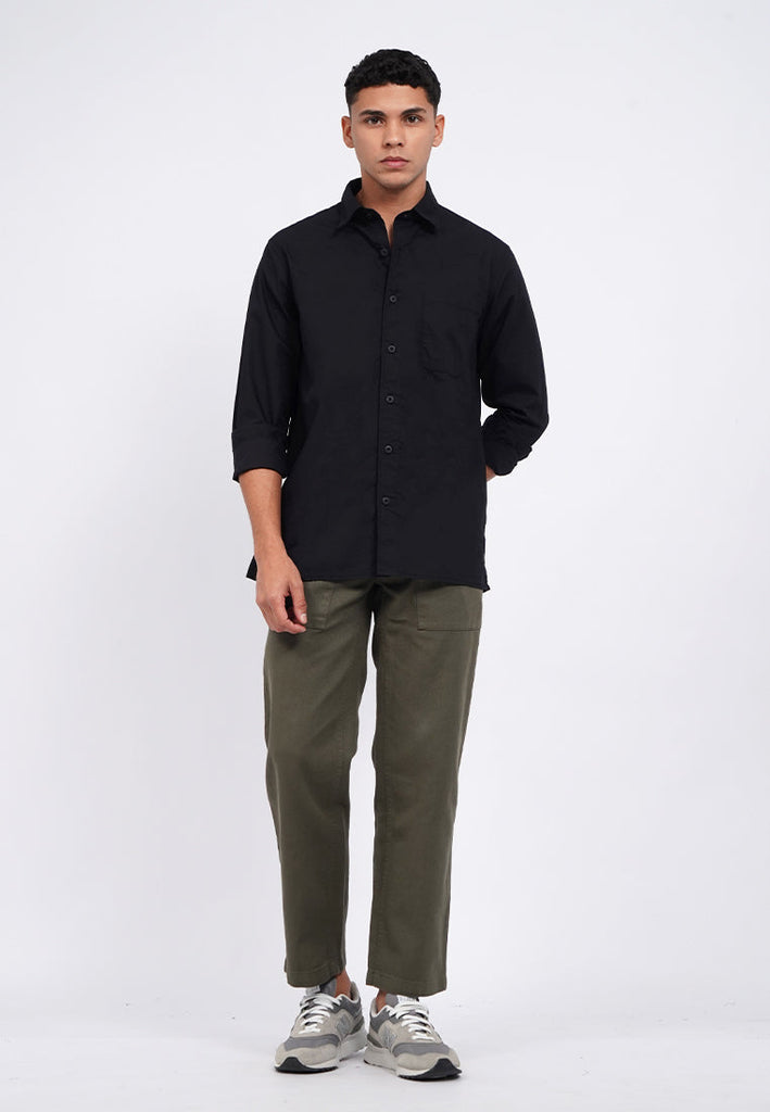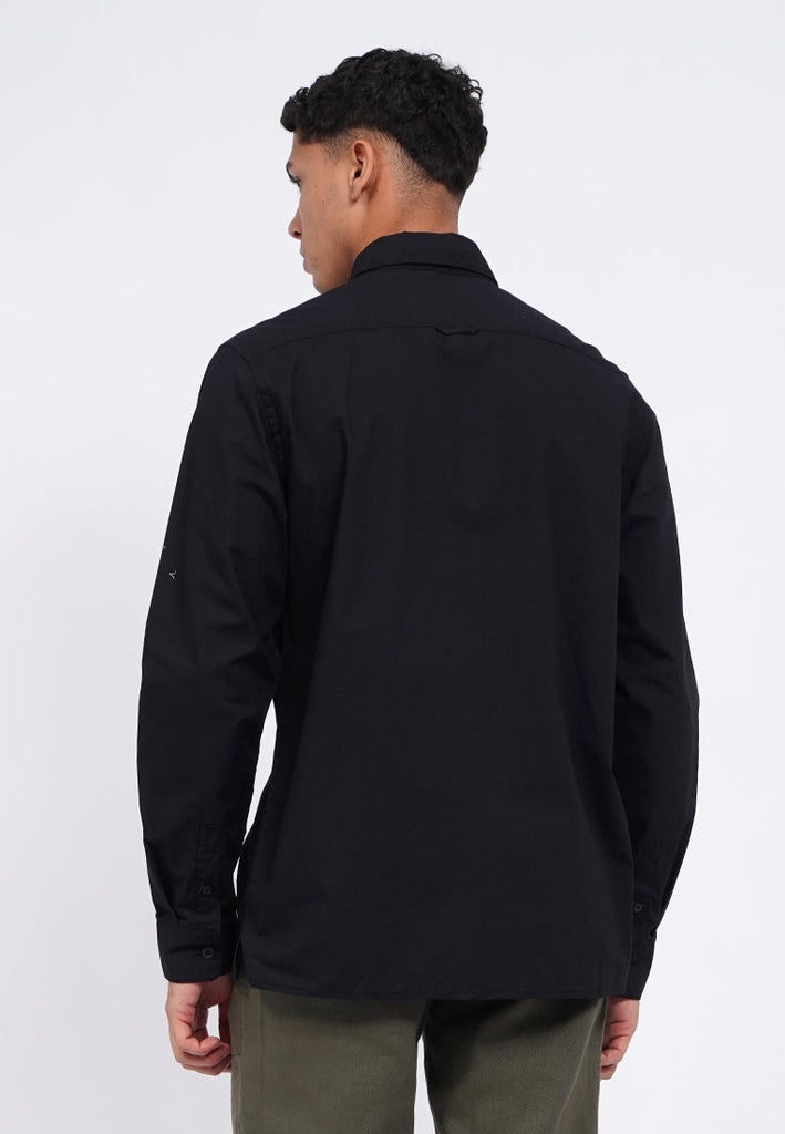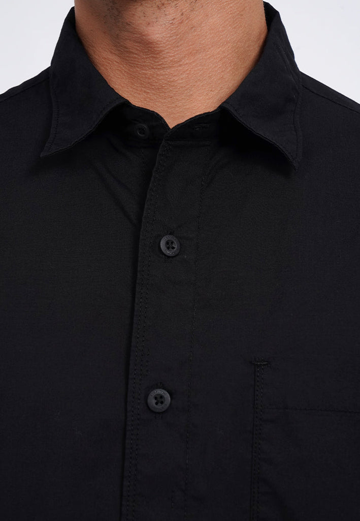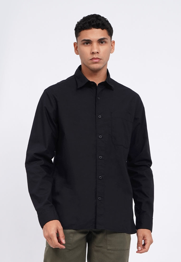 Kemeja lengan panjang, Rounded front pocket, Front button opening, Washed fabric, Material: Cotton, Fit: Regular, Color: Black, Model info: Model Wearing Size 15.5, Height: 182 cm, Chest: 94 cm, Waist: 75 cm, Hips: 96 cm