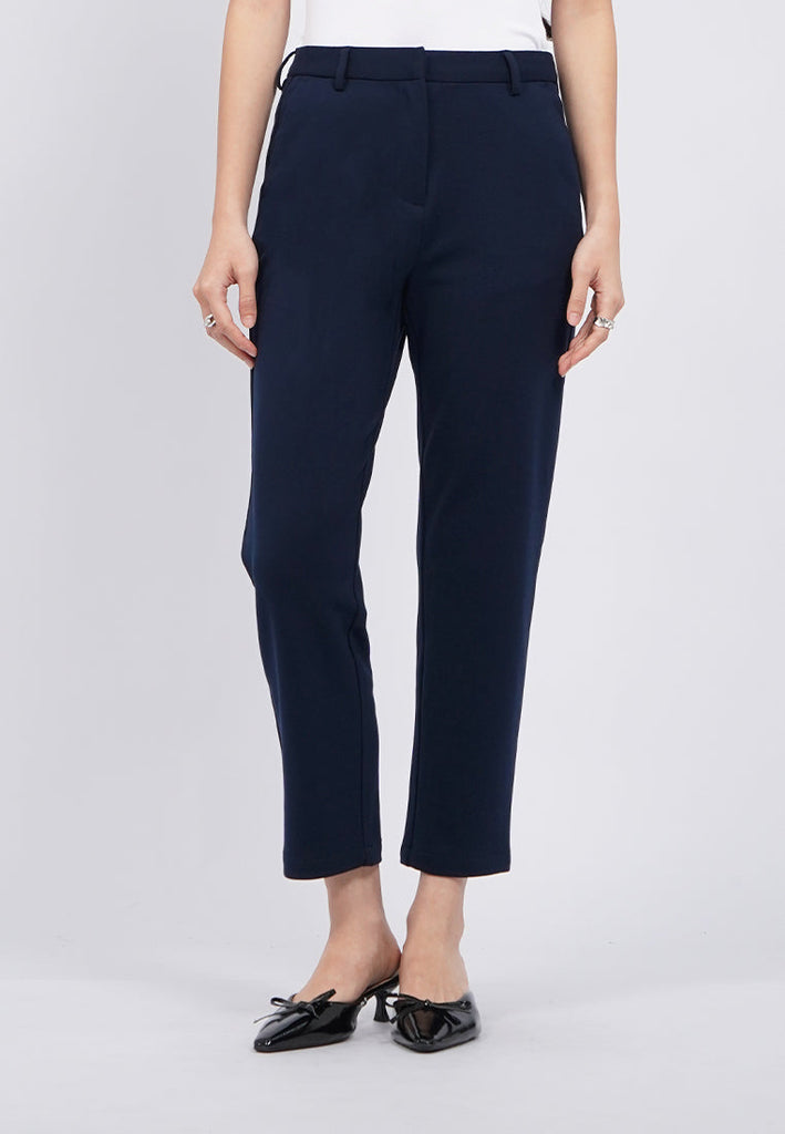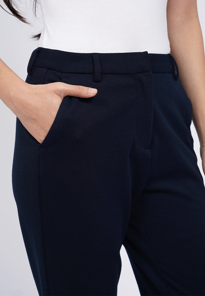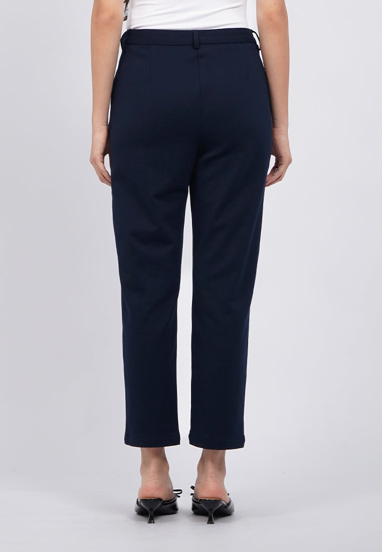 Ankle length pants, Mid rise waist, Front zipper with hook opening, Side pocket details, Material: Poly Viscose Spandex, Fit: Regular Tapered Ankle, Color: Navy, Model info: Model Wearing Size S, Height: 168cm, Bust: 74cm, Waist: 62cm, Hips: 86cm