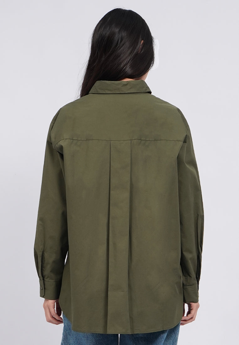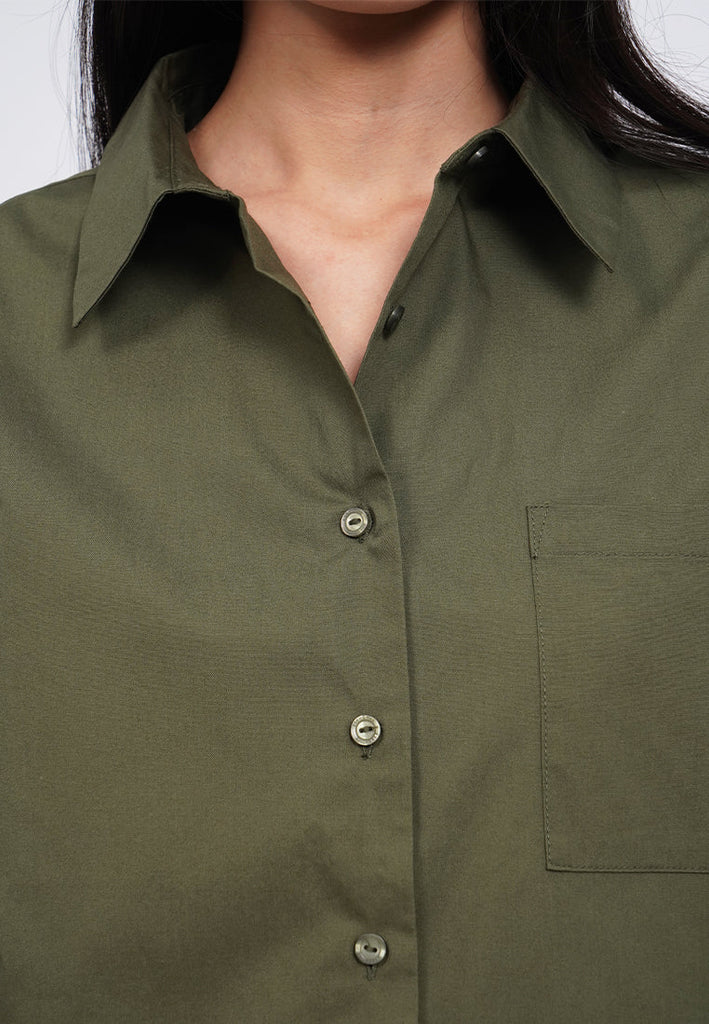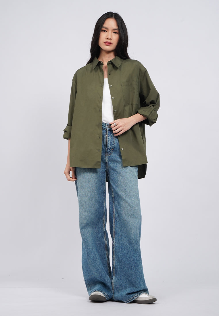 Kemeja lengan panjang, Drop shoulder, Front pocket details, Roll up sleeves, Material: Cotton, Fit: Oversized, Color: Olive, Model info: Model Wearing Size S, Height: 168cm, Bust: 74cm, Waist: 62cm, Hips: 86cm