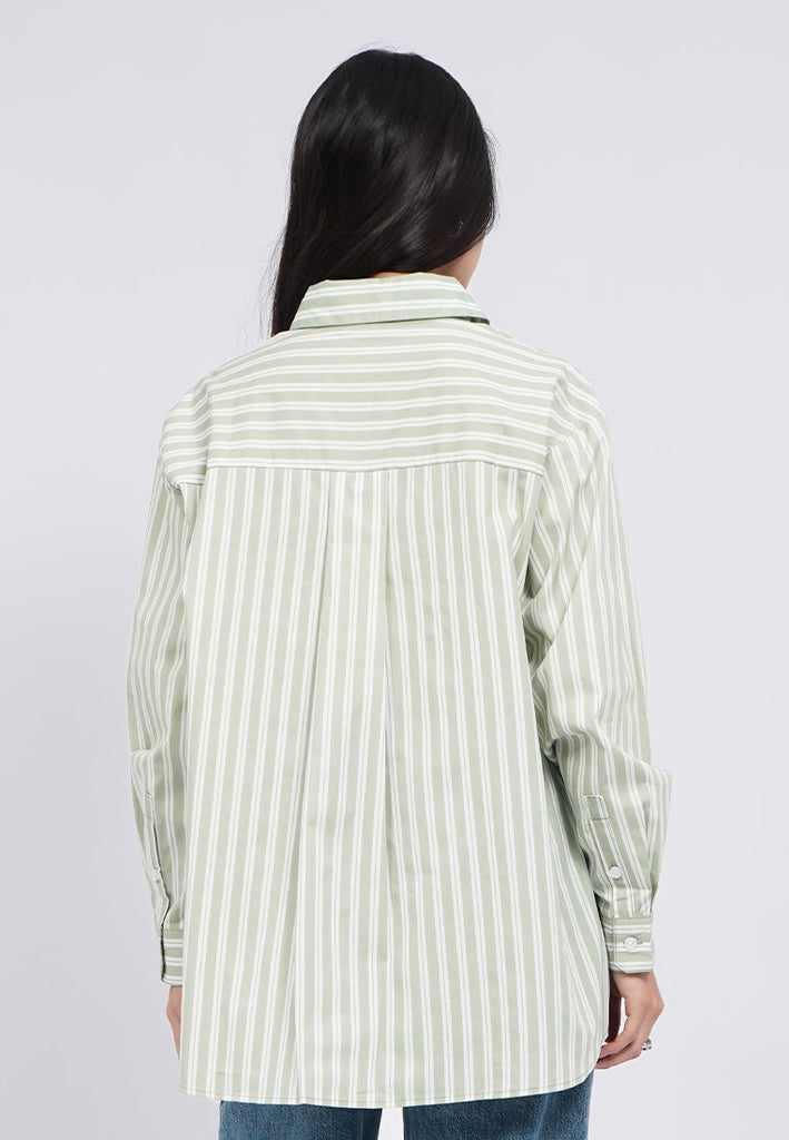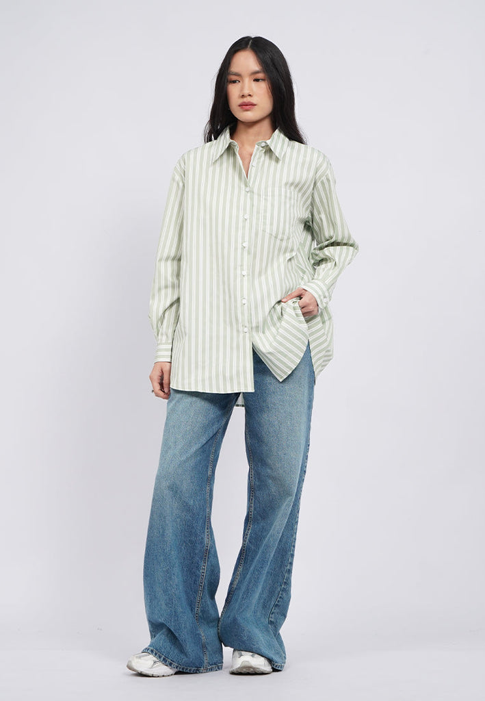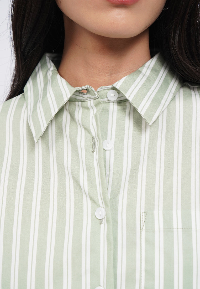 Kemeja lengan panjang, Drop shoulder, Pointed front pocket, Stripes printed fabric, Material: Cotton, Fit: Oversized, Color: Sage, Model info: Model Wearing Size S, Height: 168cm, Bust: 74cm, Waist: 62cm, Hips: 86cm