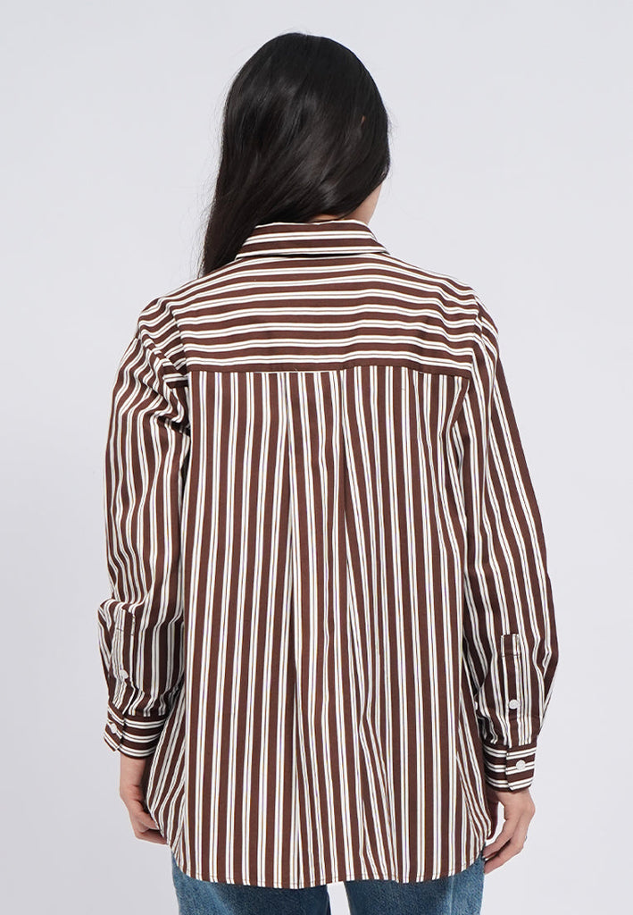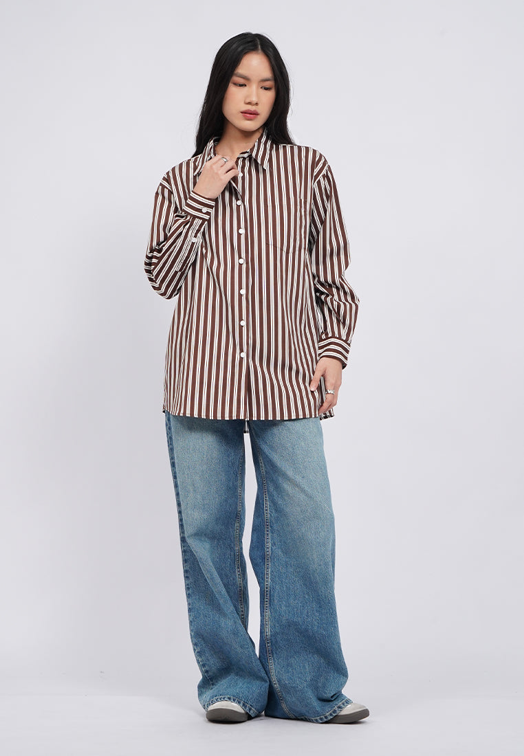 Kemeja lengan panjang, Drop shoulder, Pointed front pocket, Stripes printed fabric, Material: Cotton, Fit: Oversized, Color: Brown, Model info: Model Wearing Size S, Height: 168cm, Bust: 74cm, Waist: 62cm, Hips: 86cm