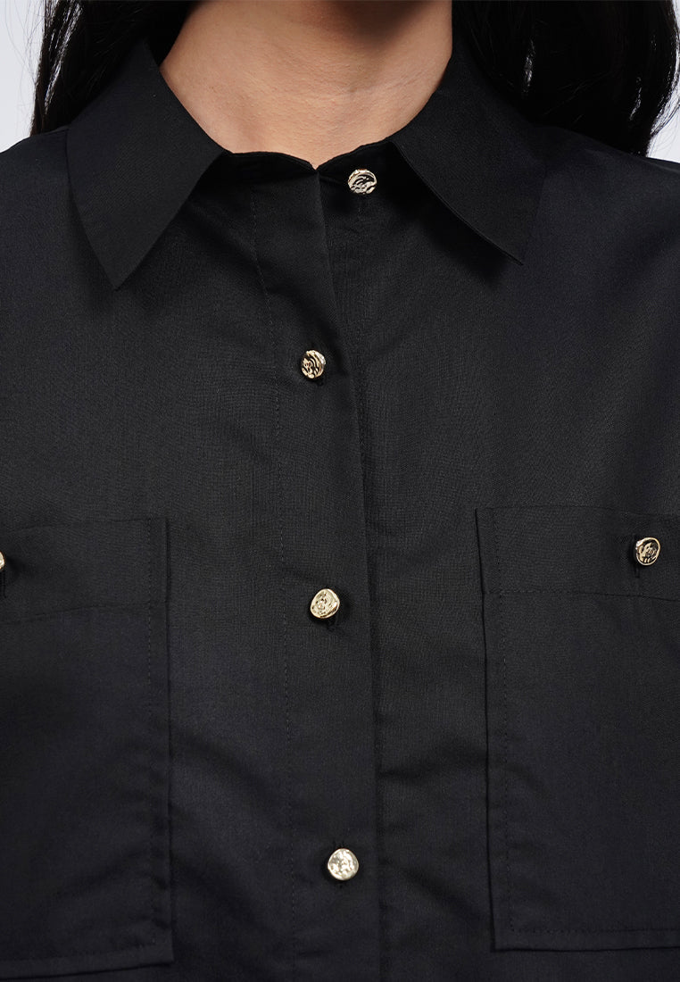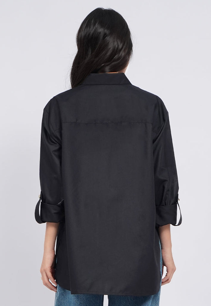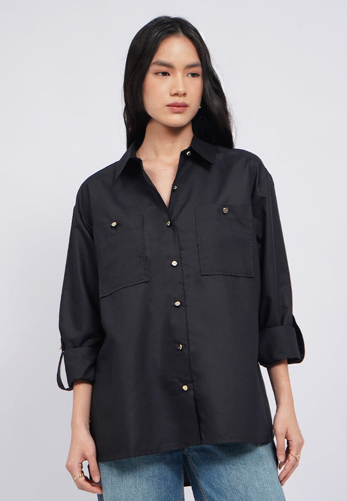 Kemeja lengan panjang, Contrast button details, Double front pocket, Roll up sleeves, Material: Polyester, Fit: Oversized, Color: Black, Model info: Model Wearing Size S, Height: 168cm, Bust: 74cm, Waist: 62cm, Hips: 86cm