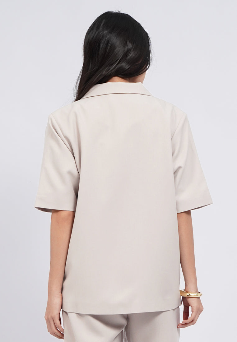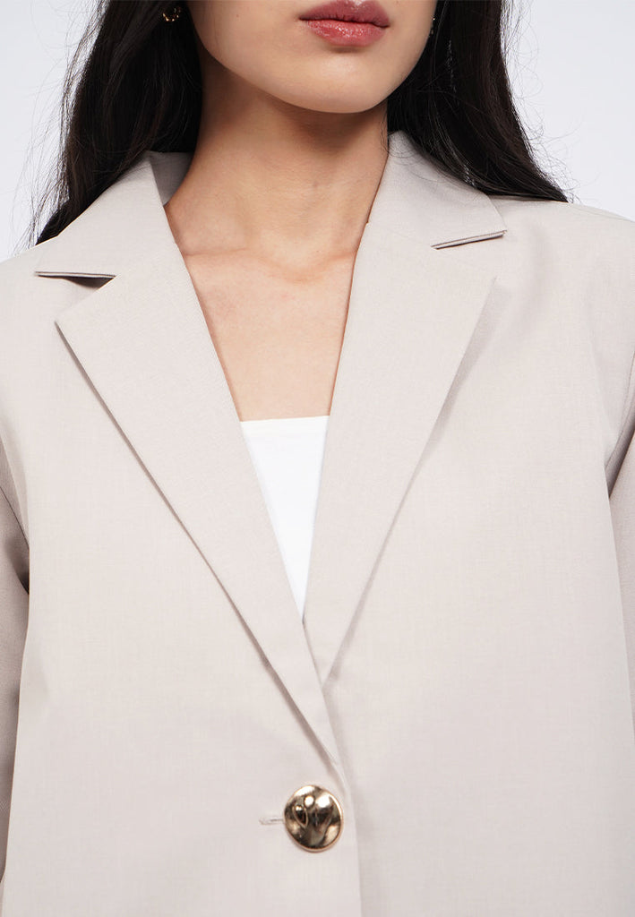 Blazer lengan pendek, V-neck with lapel, Single fancy button opening, Material: Twill, Fit: Oversized, Color: Beige, Model info: Model Wearing Size S, Height: 168cm, Bust: 74cm, Waist: 62cm, Hips: 86cm