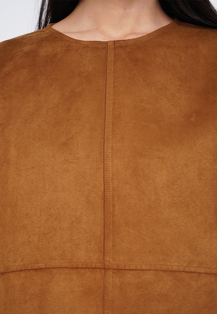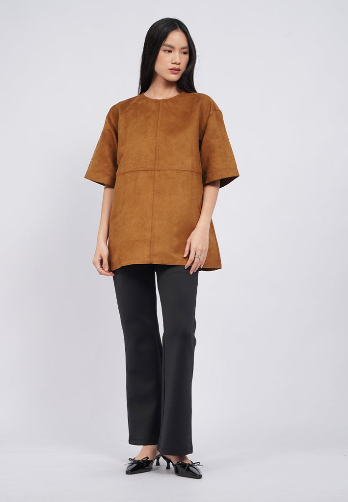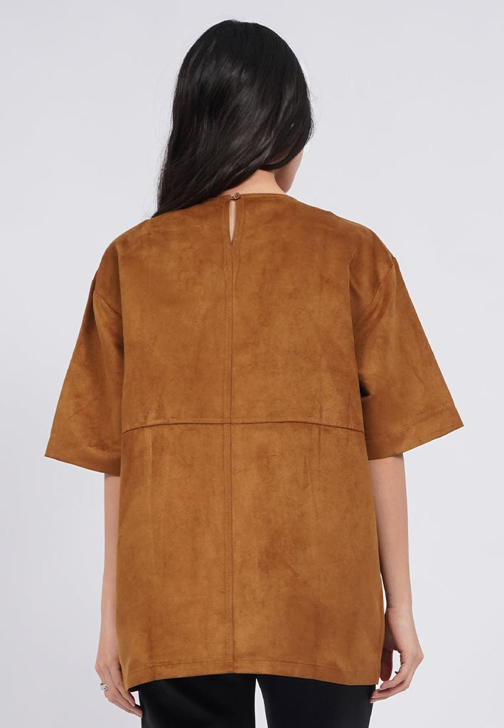 Atasan lengan pendek, Round neck, Drop shoulder, Back button opening, Textured fabric, Material: Suede, Fit: Oversized, Color: Golden Brown, Model info: Model Wearing Size S, Height: 168cm, Bust: 74cm, Waist: 62cm, Hips: 86cm