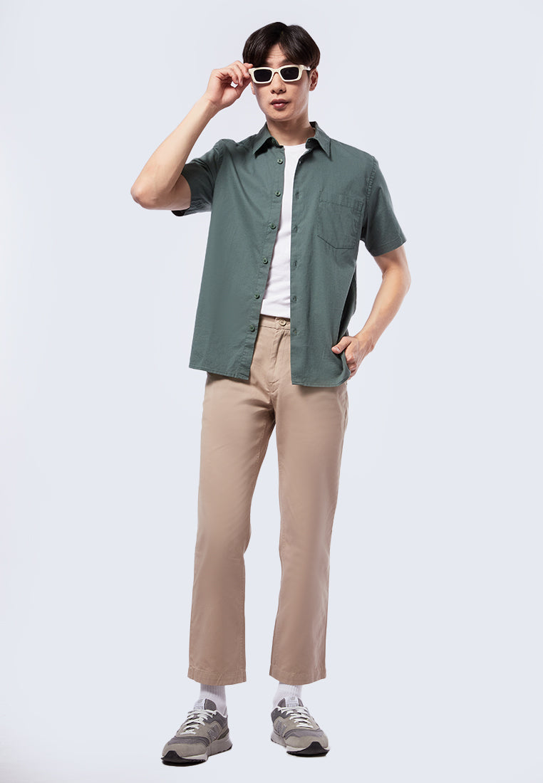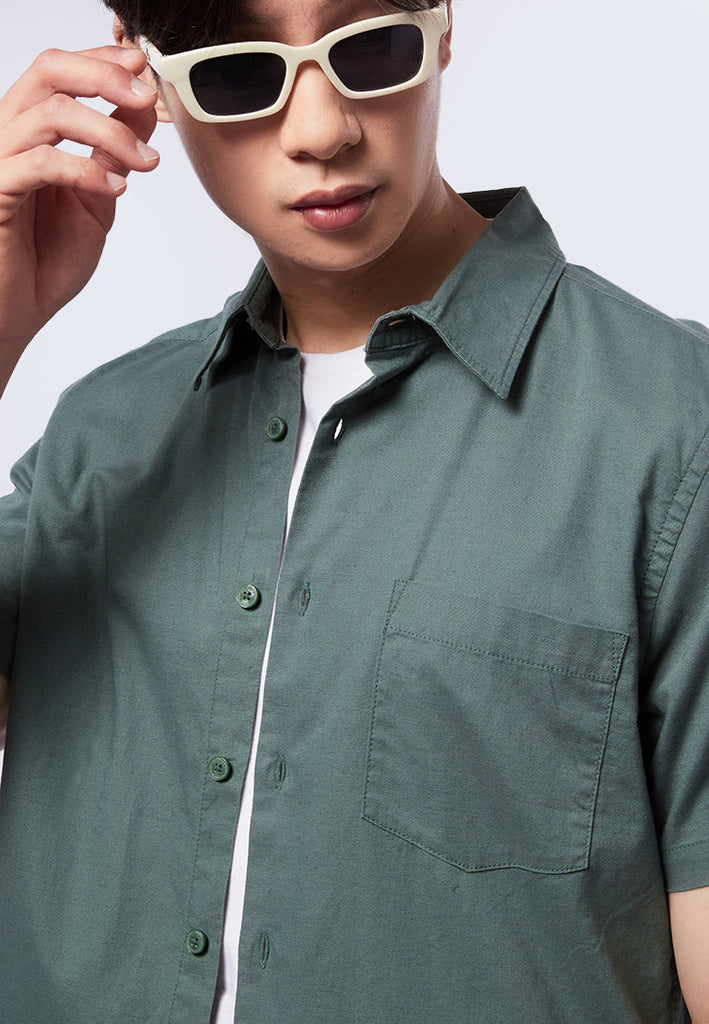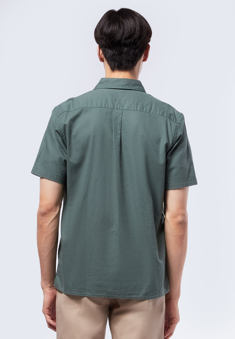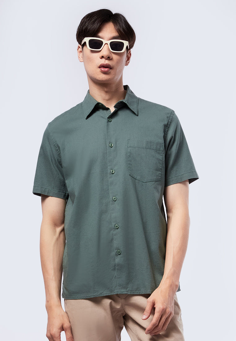 Kemeja lengan pendek, Pointed front pocket, Front button opening, Material: Cotton, Fit: Regular, Color: Dusty Green, Model info: Model Wearing Size 16 for Top, Size 31 for pants, Model Height 184 cm, Bust: 91 cm, Waist: 77 cm, Hips: 97 cm, Art: 1-SSRCRT223J427