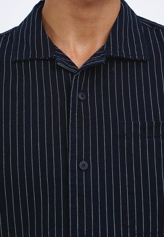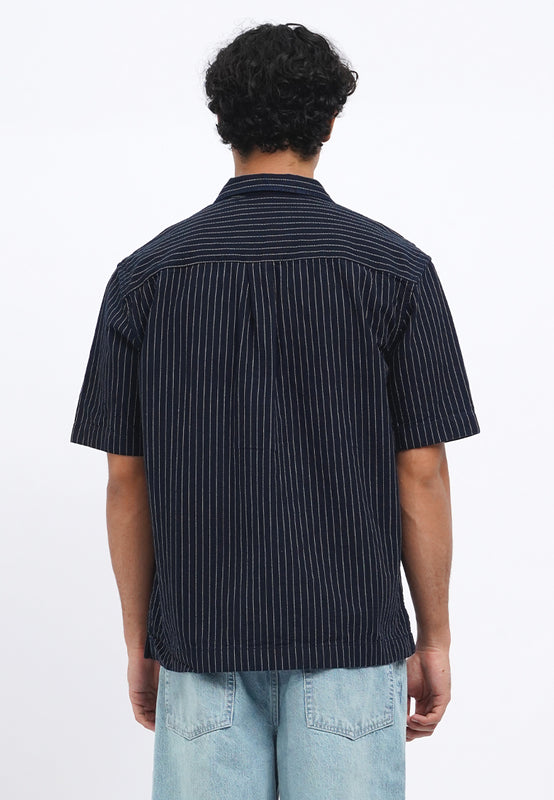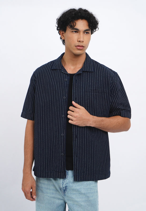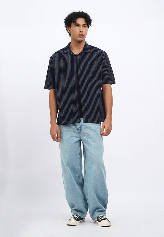 - Kemeja lengan pendek dengan fitting relaxed dengan washing dark blue dan motif bergaris vertikal, menggunakan resort collar. Bukaan menggunakan kancing pada bagian depan. Berbahan denim 100% cotton yang nyaman saat dipakai
