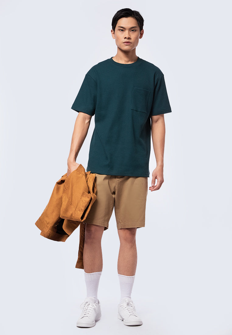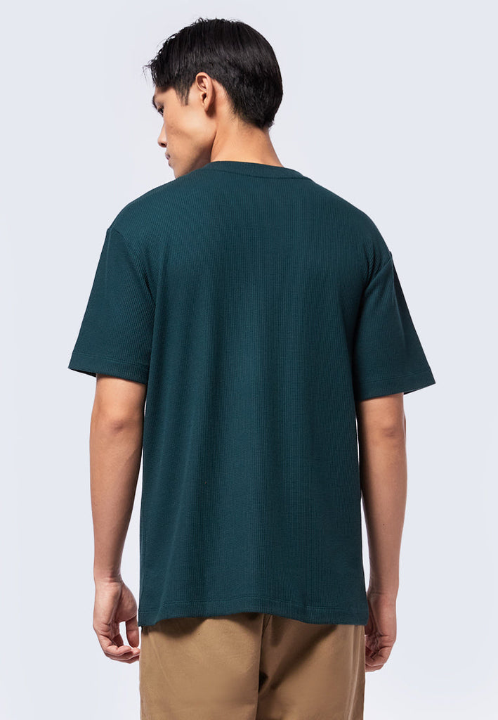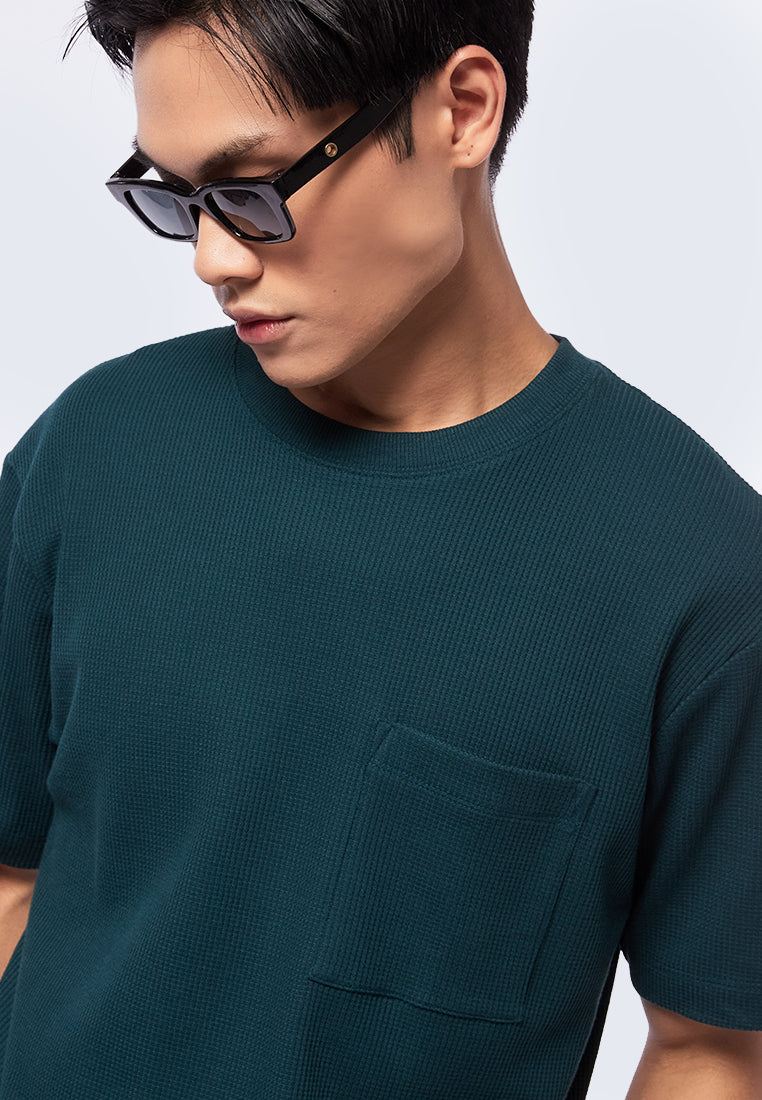 T-shirt lengan pendek, Round neck, Front pocket details, Textured fabric, Material: Polyester, Material: POL_65%, Fit: Regular, Color: Bottle Green, Model info: Model Wearing Size 15.5 for Top, Size 32 for pants, Model Height 186 cm, Bust: 88 cm, Waist: 69 cm, Hips: 85 cm, Art: 1-TSRCRT223L492