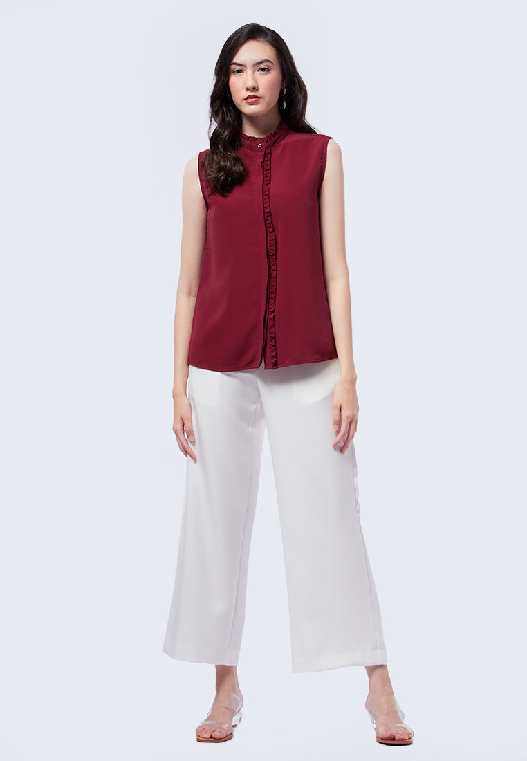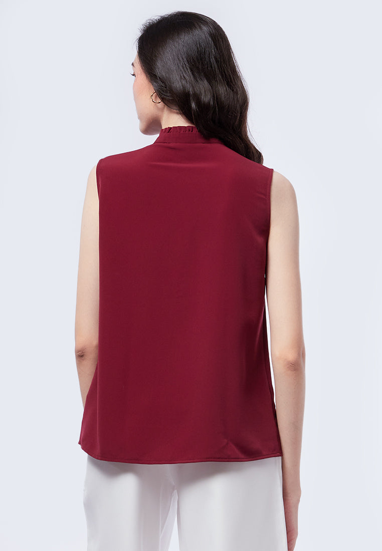 Blouse tanpa lengan, High neck with ruffle details, Hidden front button opening, Material: Polyester, Fit: Regular, Color: Maroon, Model info: Model Wearing Size S for Top, Size S for Pants, Model Height 175 cm, Bust: 77 cm, Hips: 88 cm, Art: 5-SLWKSG223K063