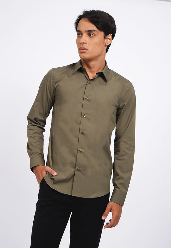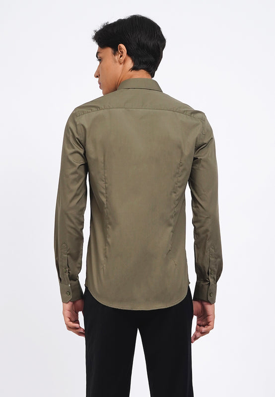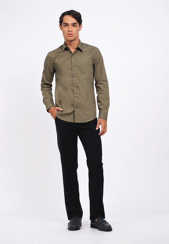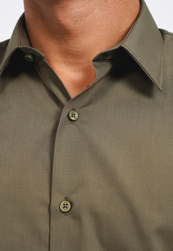 Kemeja lengan panjang, Curved bottom hem, Front button opening, Material: Cotton, Fit: Slim, Color: Olive, Model info: Model Wearing Size 15.5, Model Height 185 cm, Bust: 91 cm, Waist: 80, Hips: 93 cm
